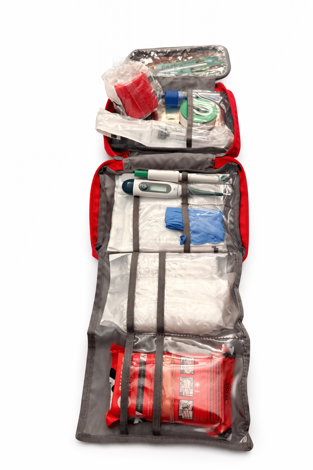 - Empfohlen wird eine halbierte Rolle Frischhaltefolie selbst in das Set zu geben um Verletzungen am Rumpf Luft/wasserdicht zu versorgen. (Achtung beim schneiden der Rolle, achten Sie auf einen sauberen Schnitt, sonst könnte die Folie beim abrollen immer wieder reißen)