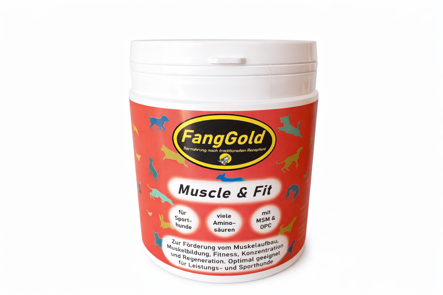 FangGold Muscle & Fit ist ein Ergänzungsfutter in Pulverform für Hunde aller Rassen, ab 4 Monaten, im Sport- und Leistungsbereich. Bestehend aus natürlichen Inhaltsstoffen wie Hefe, Hanf, Kräutern, Proteinen, Vitaminen und essenziellen Aminosäuren.